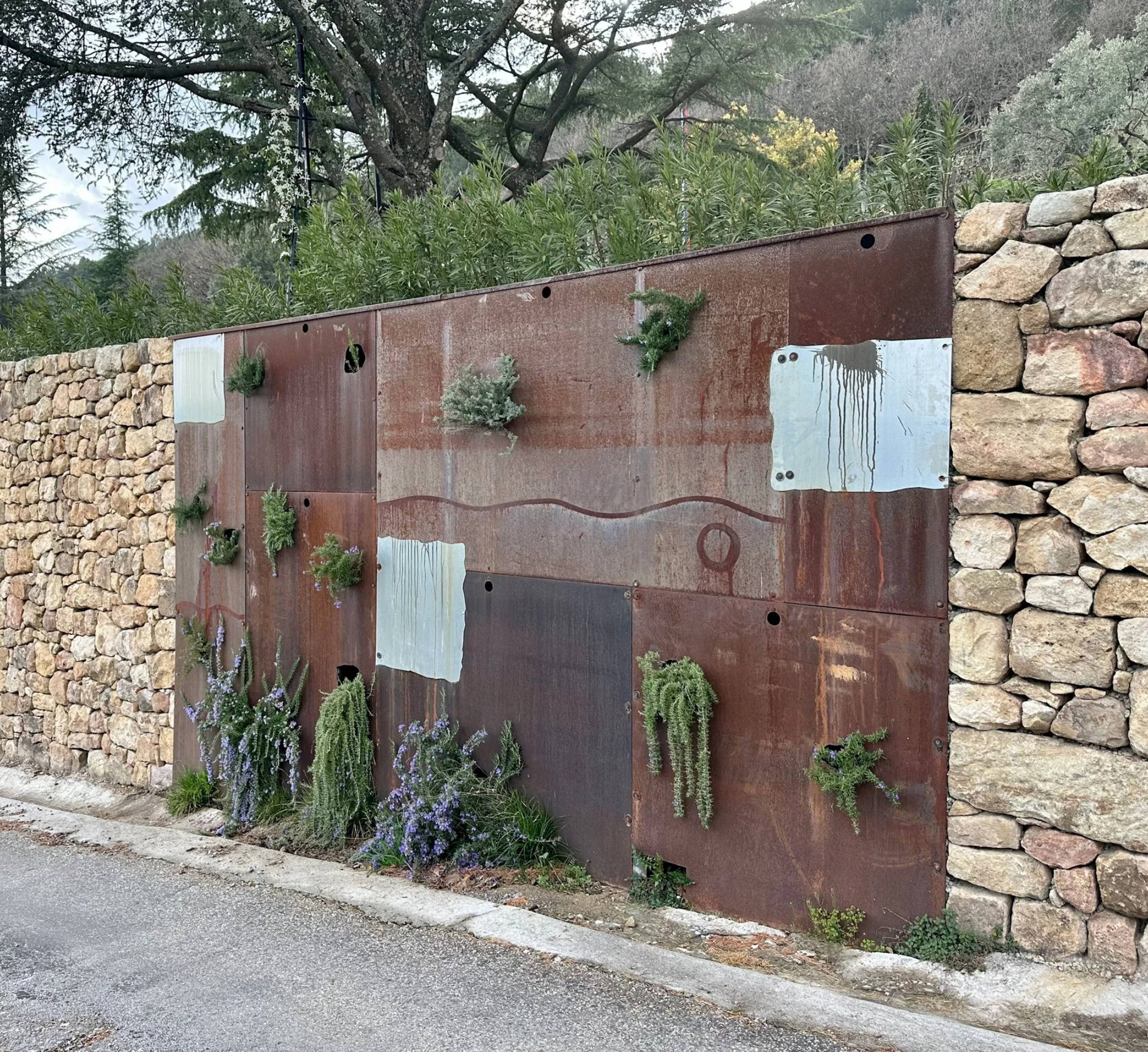 Nous allons occuper les extrémités sud de cinq niveaux de faÿsses, dans la rouvière, avec des chapelles dans l’esprit de celles que l’on rencontre au bord des routes en Grèce. Elles seront laïques et contiendront des œuvres en trois dimensions : La seconde, qui aura la forme d’une petite usine, contiendra une œuvre de Bruno d’Abrigeon. Un Arrosoir Républicain à trois pommes bleues, blanc et rouge.